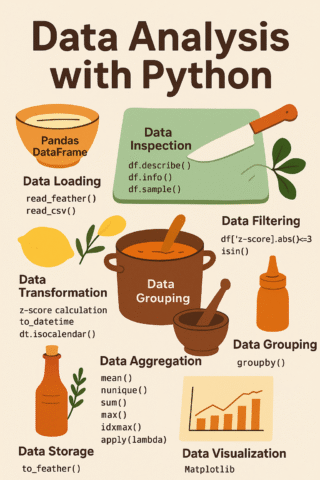 - Data Transformation (z-score calculation, to_datetime, dt.isocalendar()): Chopping, seasoning, and preparing the ingredients.